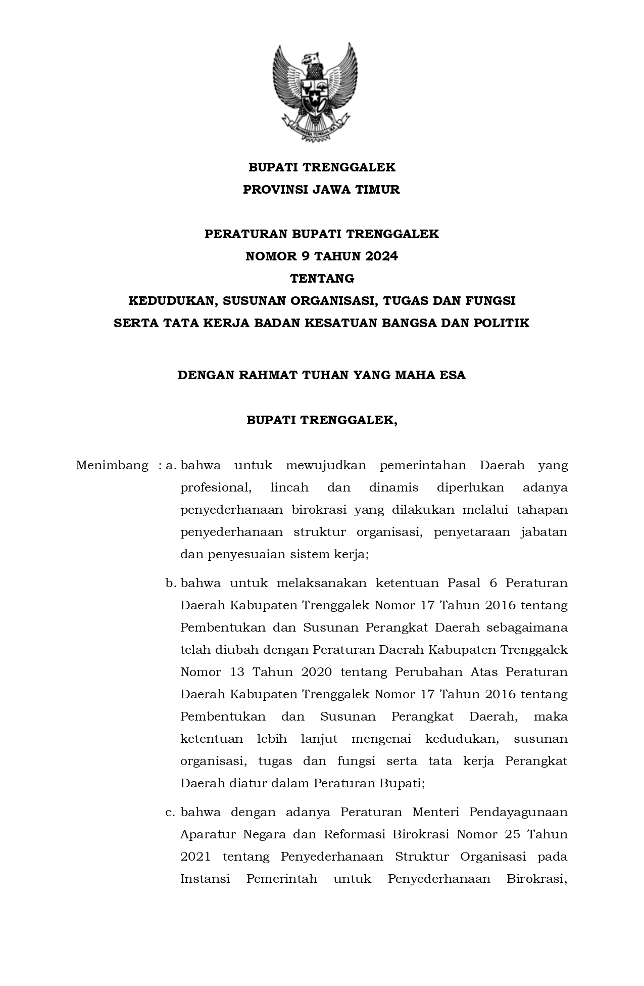 Berikut merupakan SALINAN FINAL PERBUP SOTK BAKESBANGPOL KABUPATEN TRENGGALEK